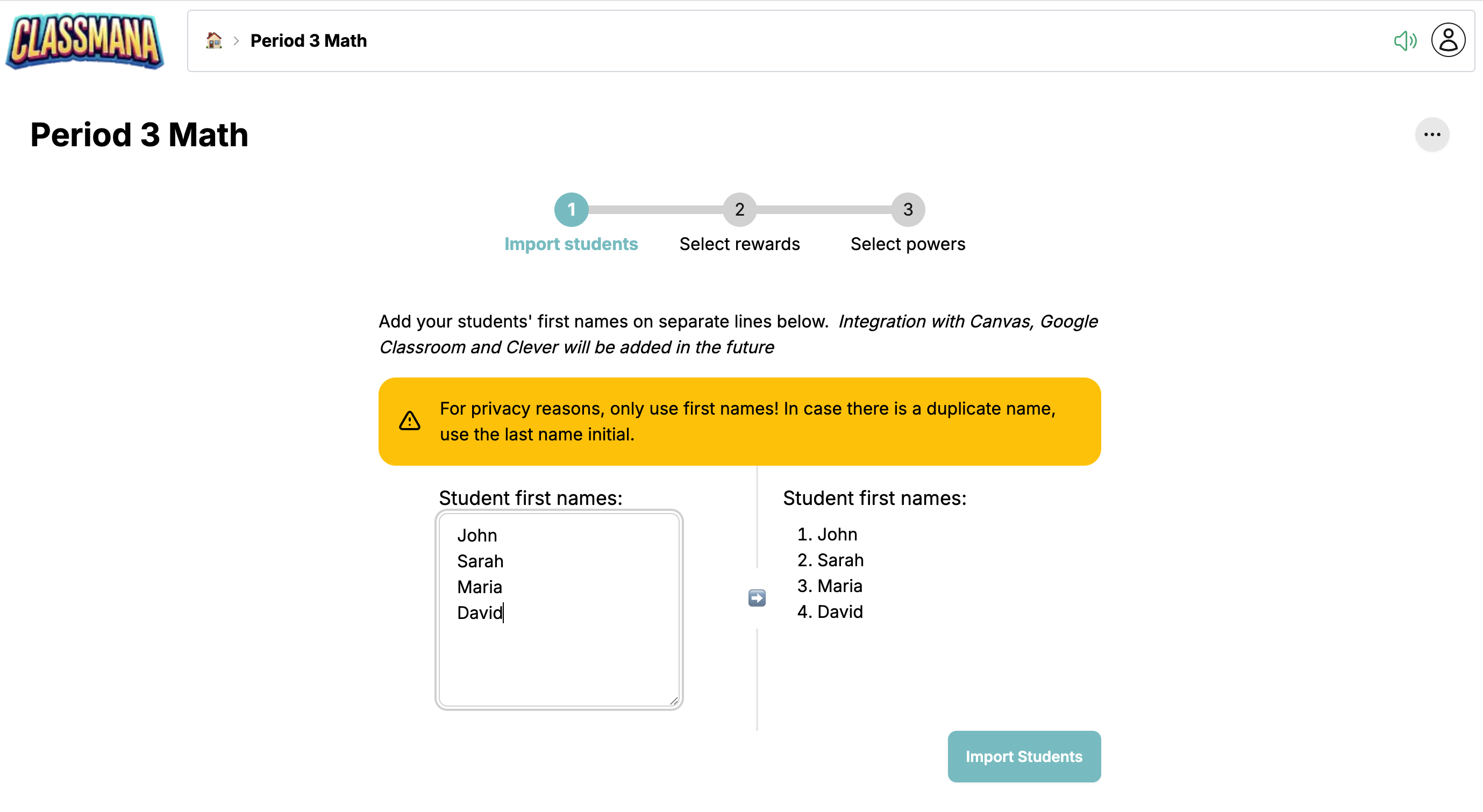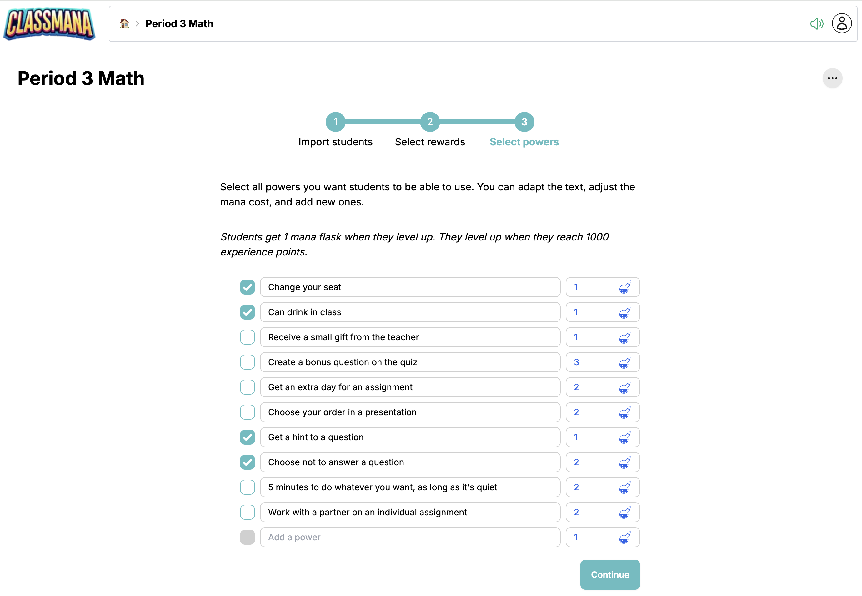 After creating your class, you'll go through a 3-step setup wizard to configure students, rewards, and powers.